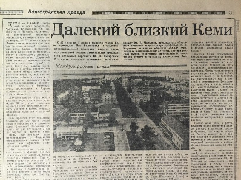 В 1953 году Кеми стал одним из первых побратимов тогда еще Сталинграда и с тех пор муниципалитеты продолжают взаимовыгодное и плодотворное сотрудничество.