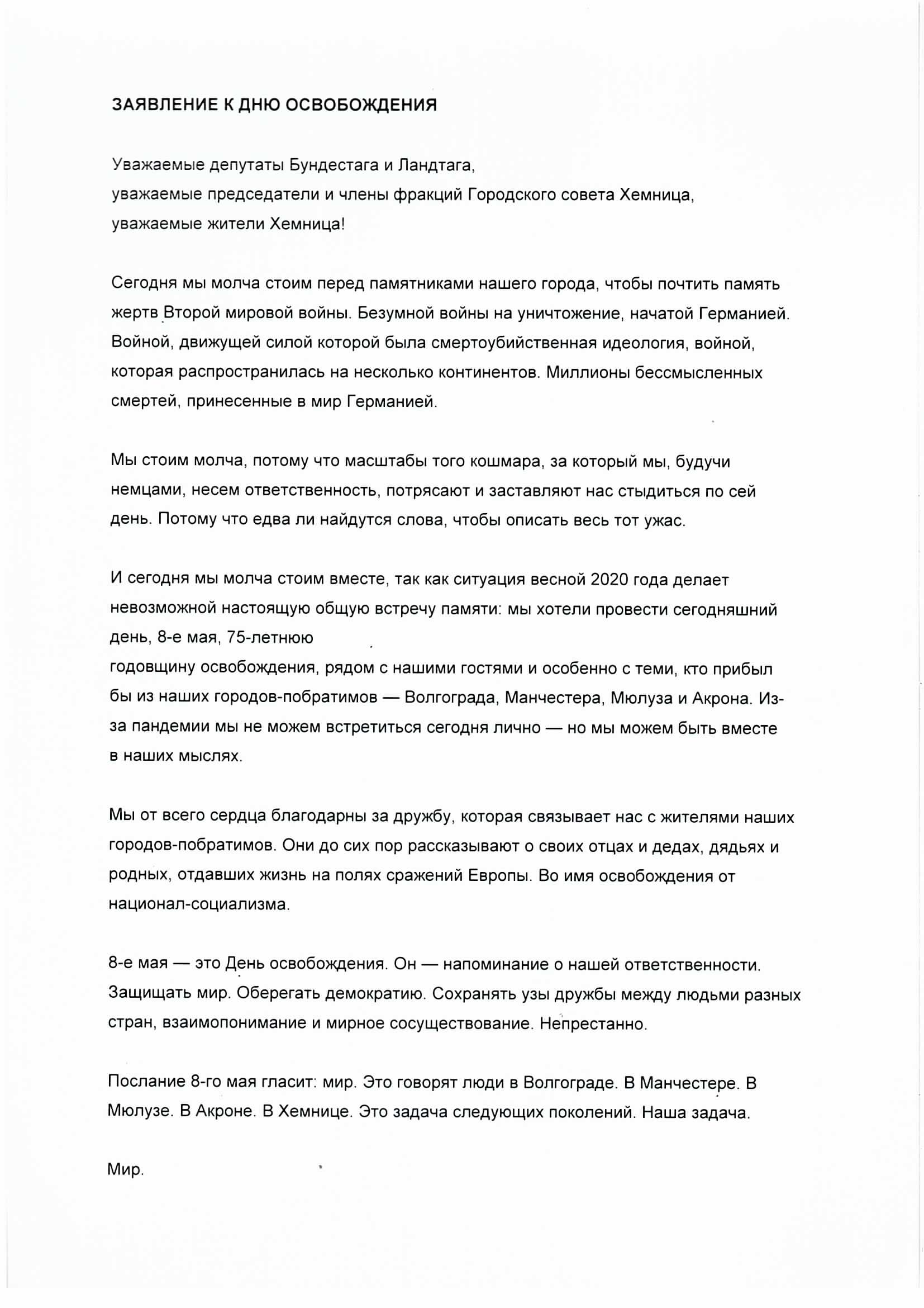 В Хемнитце состоялась памятная церемония в честь Дня освобождения