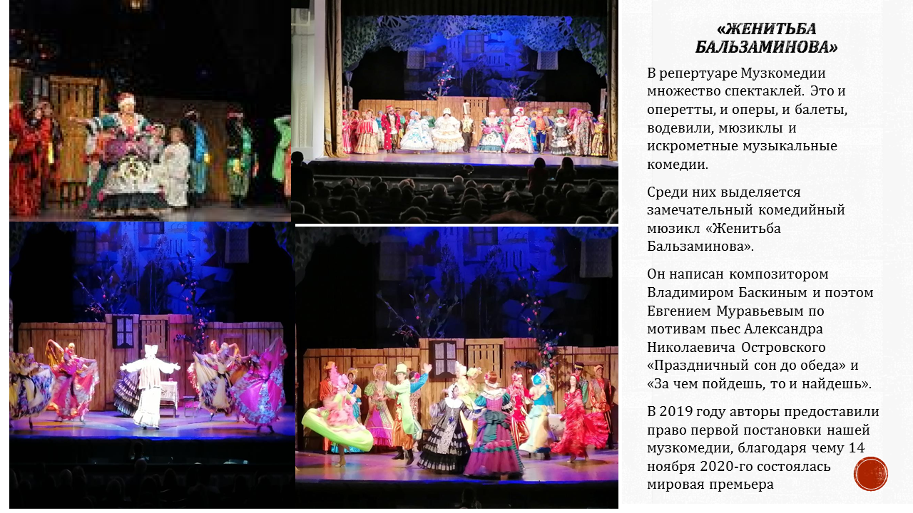 В репертуаре театра множество спектаклей. Это оперетты, оперы, балеты, водевили, мюзиклы и искрометные музыкальные комедии. Среди них и замечательный комедийный мюзикл «Женитьба Бальзаминова». Он написан композитором Владимиром Баскиным и поэтом Евгением Муравьевым по мотивам пьес Александра Николаевича Островского «Праздничный сон до обеда» и «За чем пойдешь, то и найдешь». В 2019 году авторы предоставили право первой постановки нашей музкомедии, благодаря чему 14 ноября 2020-го состоялась мировая премьера
