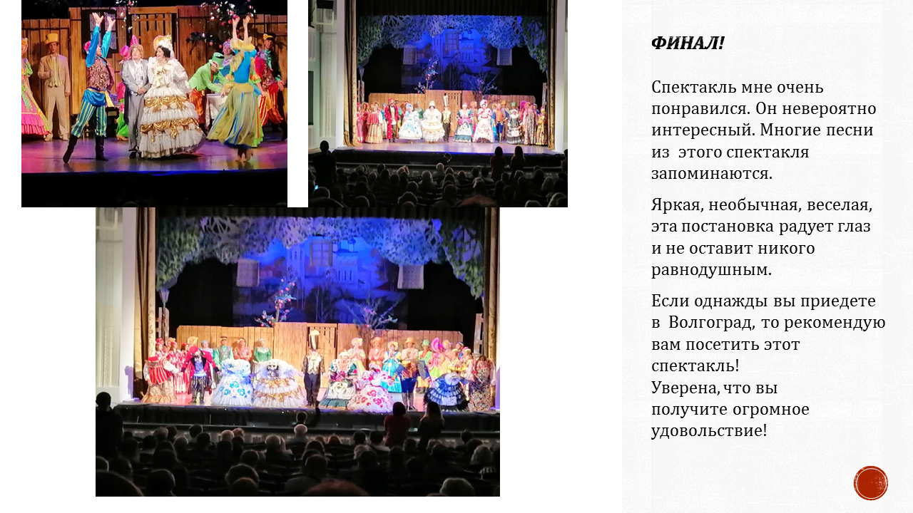 Яркая, необычная, веселая – эта постановка радует глаз и не оставит никого равнодушным. Если однажды вы приедете в Волгоград, то рекомендую вам посетить этот спектакль! Уверена, вы высоко его оцените!