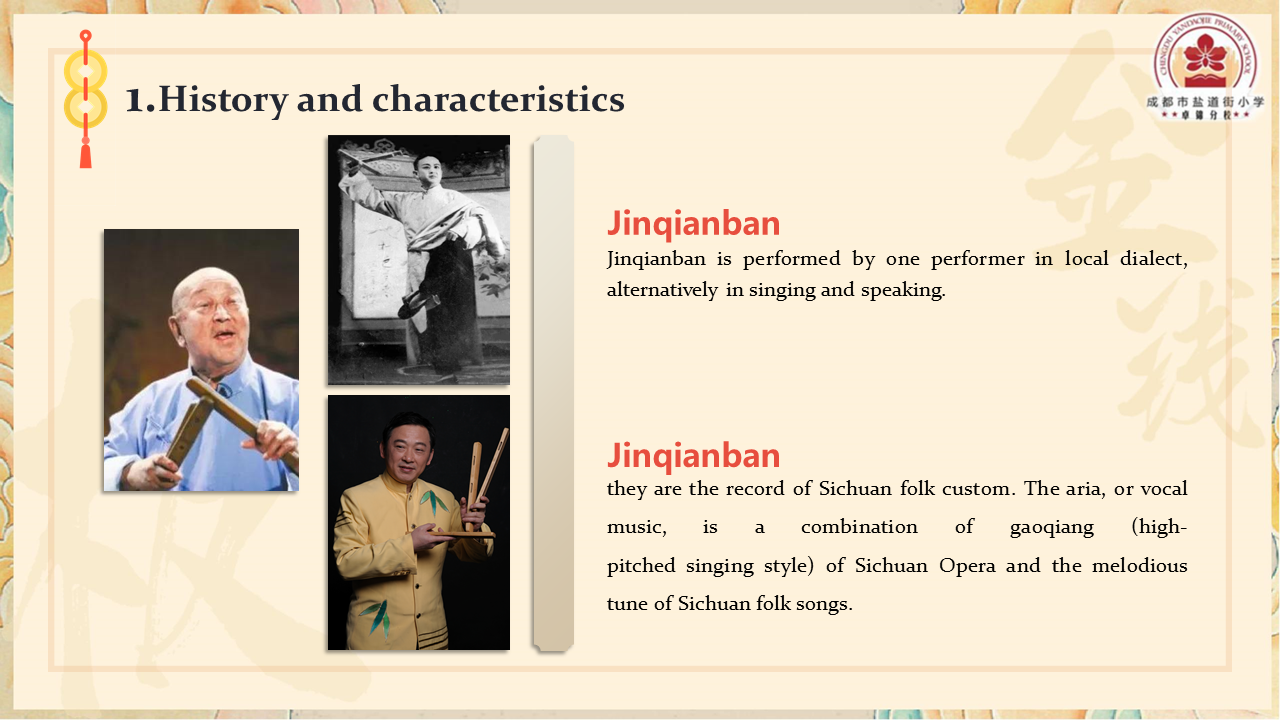 Первый из них – художественные характеристики, включая слова и музыкальные инструменты. Цзиньцяньбань исполняется на местном диалекте, причем пение чередуется с обычной речью. Текст сычуаньских песен очень прост для понимания, а их содержание обычно юмористическое. Главный музыкальный инструмент, используемый при выступлении, состоит из трёх бамбуковых колотушек, символизирующих три традиционных элемента китайской культуры: небо, землю и народ. Также он воплощает пожелание китайского народа, "чтобы был мир между небом, землёй и людьми".