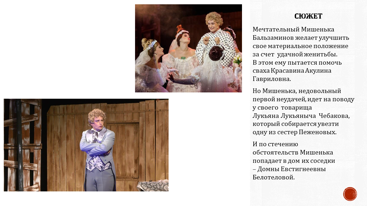 The theater's repertory features numerous productions. There are operettas, operas, ballets, vaudevilles, musicals and sparklingly funny musical comedies. One among them is a wonderful musical comedy "Balzaminov's Marriage". It was written by a composer Vladimir Baskin and a poet Yevgeny Muravyov, and is based on two plays by Alexander Ostrovsky: "A Holiday Dream (comes true) Before Dinner" and "Whatever You Go For, You'll Find". In 2019, the authors granted to our musical comedy the rights to the first production of their play, and, thanks to them, it was in our theater that the world premiere took place on November 14, 2020.