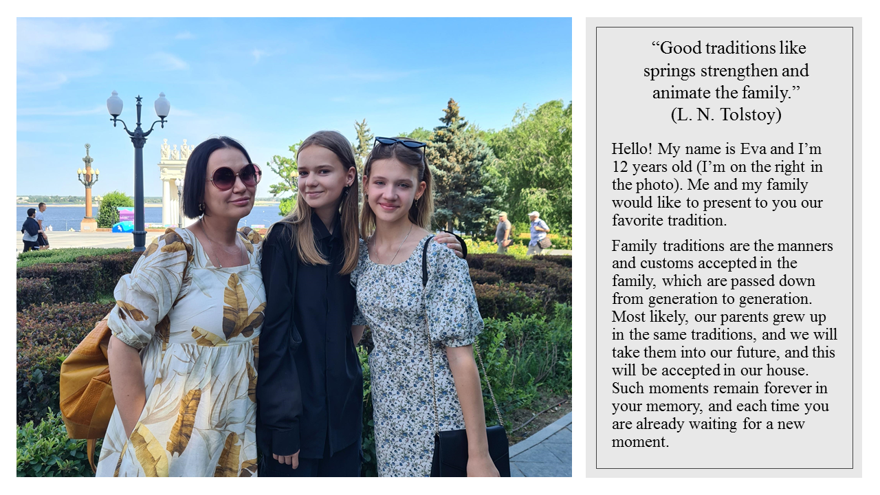 Hello! My name is Eva and I'm 12 years old (I'm on the right in the photo). Me and my family would like to present to you our favorite tradition.