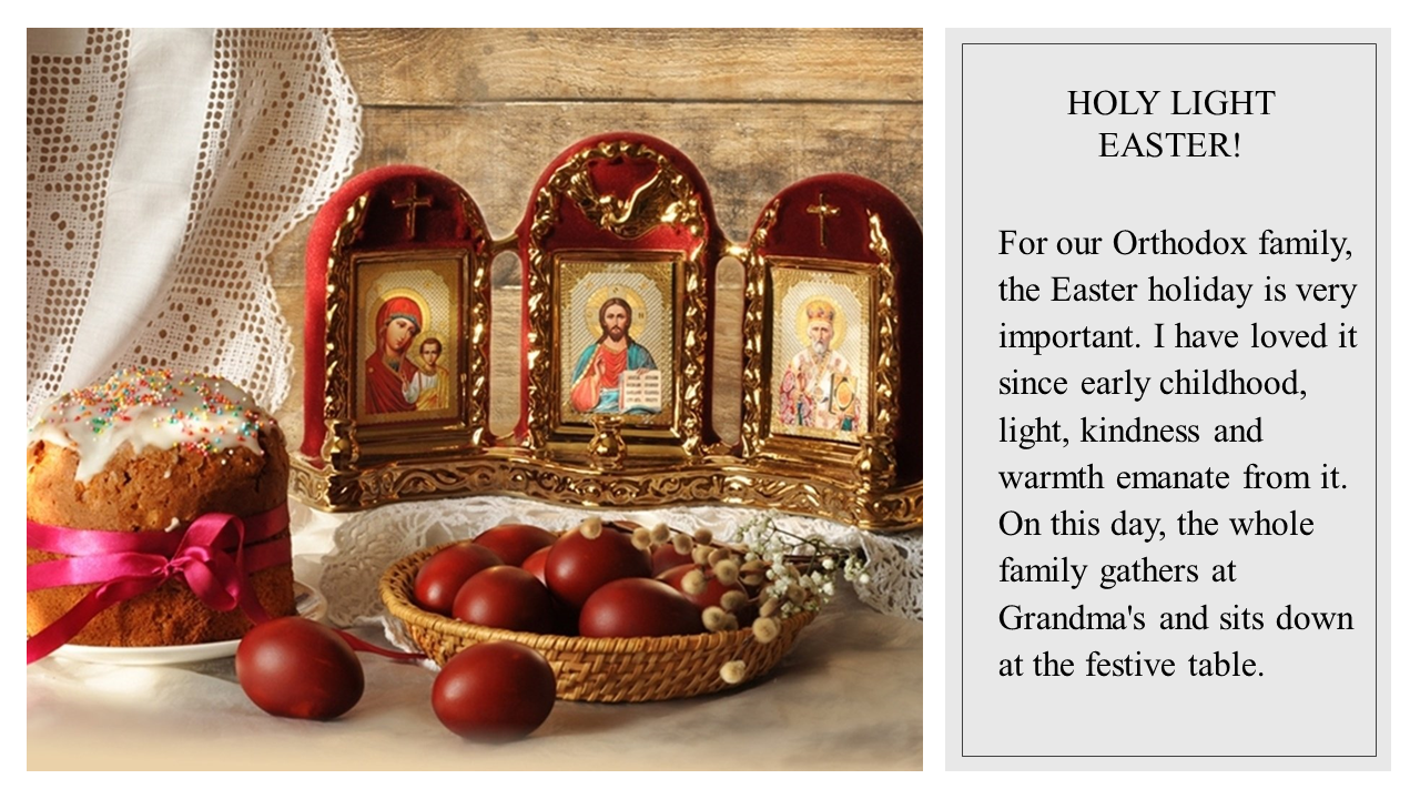 For our Orthodox family, the Easter holiday is very important. I have loved it since early childhood, light, kindness and warmth emanate from it. On this day, the whole family gathers at Grandma's and sits down at the festive table.