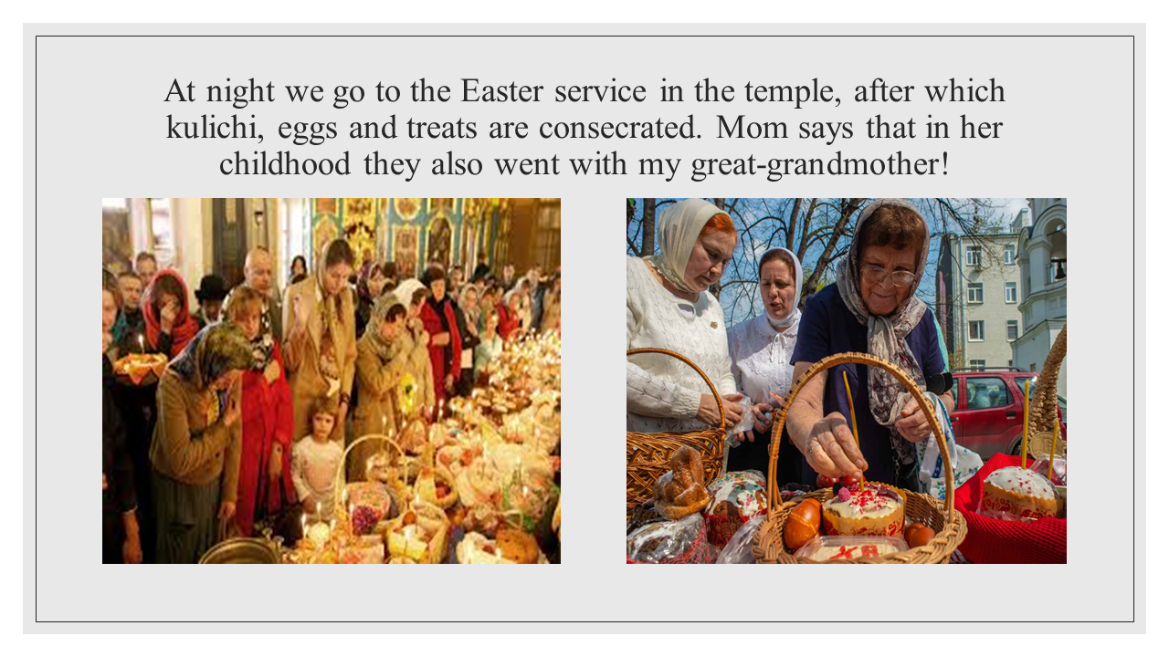Does your family have any traditions linked to the Russian national customs? Our next participant's family surely does, and loves them dearly! Eva Kochergina, the 6th grade student of Gymnasium No. 3 will tell us how relatives and herself celebrate Easter.