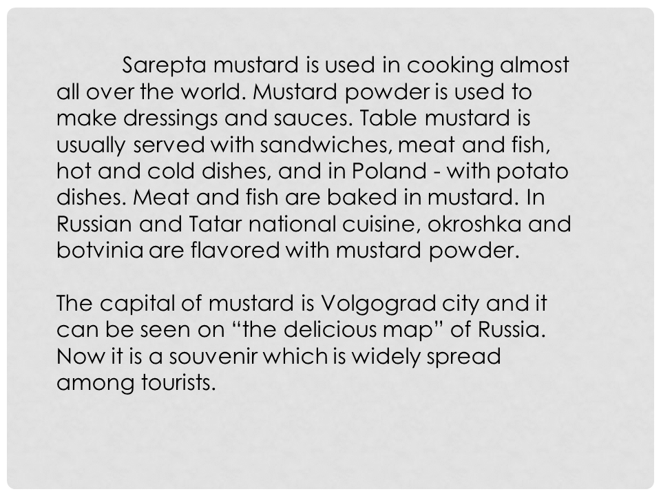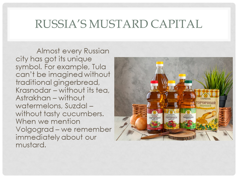 Almost every Russian city has got its unique symbol. For example, Tula can't be imagined without traditional gingerbread, Krasnodar – without its tea, Astrakhan – without watermelons, Suzdal – without tasty cucumbers. When we mention Volgograd – we remember immediately about our mustard.
