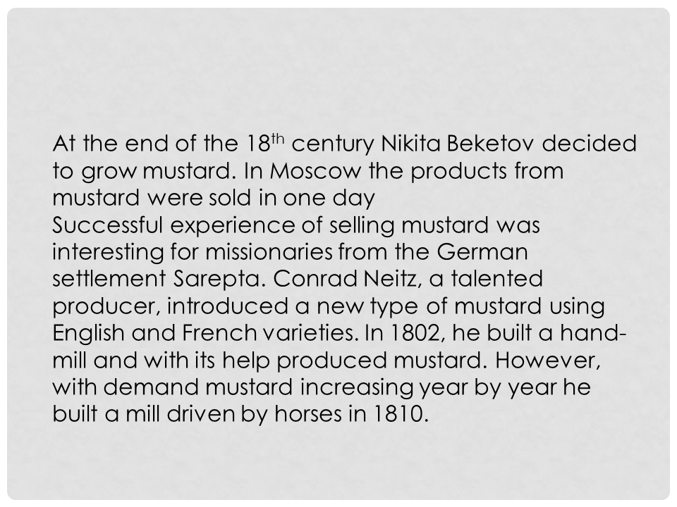 At the end of the 18th century, Nikita Beketov decided to grow mustard. In Moscow, his products from mustard were sold out in one day. The successful experience of selling mustard was interesting for missionaries from the German settlement Sarepta. Conrad Neitz, a talented producer, introduced a new type of mustard using English and French varieties. In 1802, he built a hand-mill and with its help produced mustard. However, with demand mustard increasing year by year he built a mill driven by horses in 1810.
