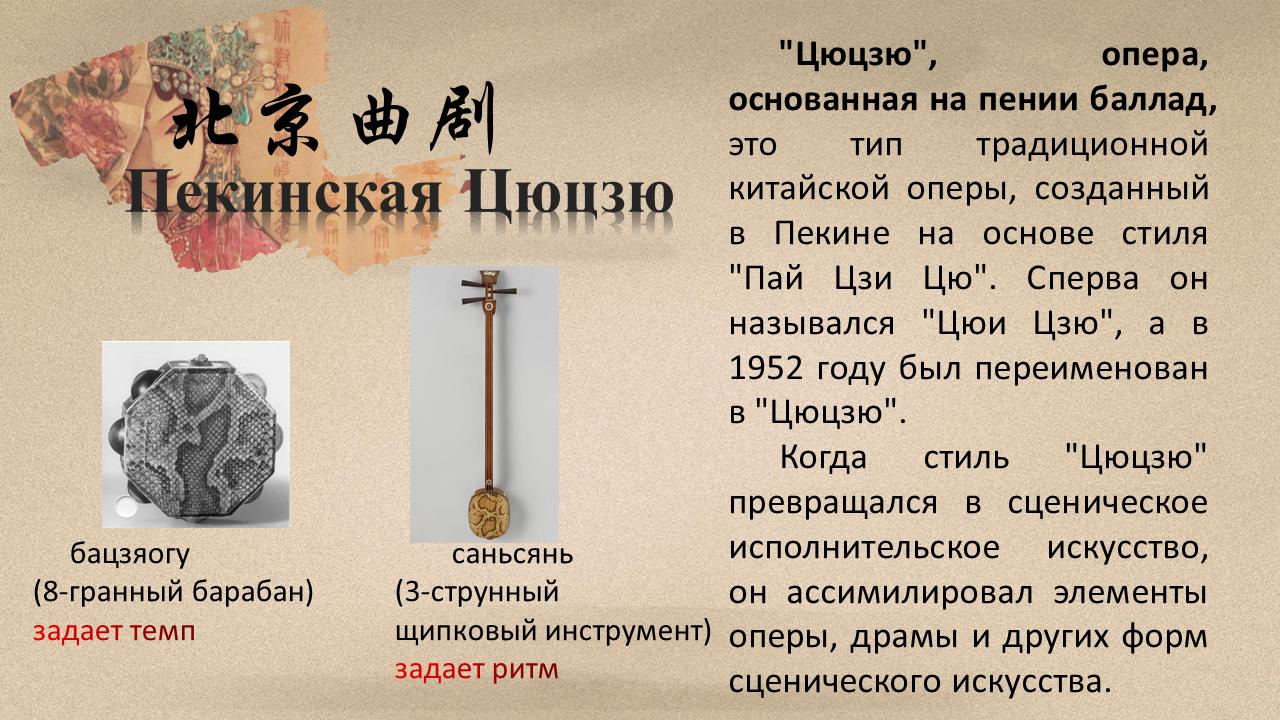 Quju, opera derived from ballad singing, is a type of traditional Chinese opera developed from the popular one-stringed Pai Zi Qu in Beijing. It was originally called Quyi Ju and was renamed Quju in 1952. Single string Paiziqu, also known as "Octagonal Drum", is a kind of rap art that uses Paiziqu couplet, three strings accompaniment and octagonal drum percussion to sing stories. It has rich tunes and various forms. When Beijing Quju gradually developing into stage performance art, it had absorbed and borrowed from traditional Chinese opera, drama and other forms as the basis for creating Quju.