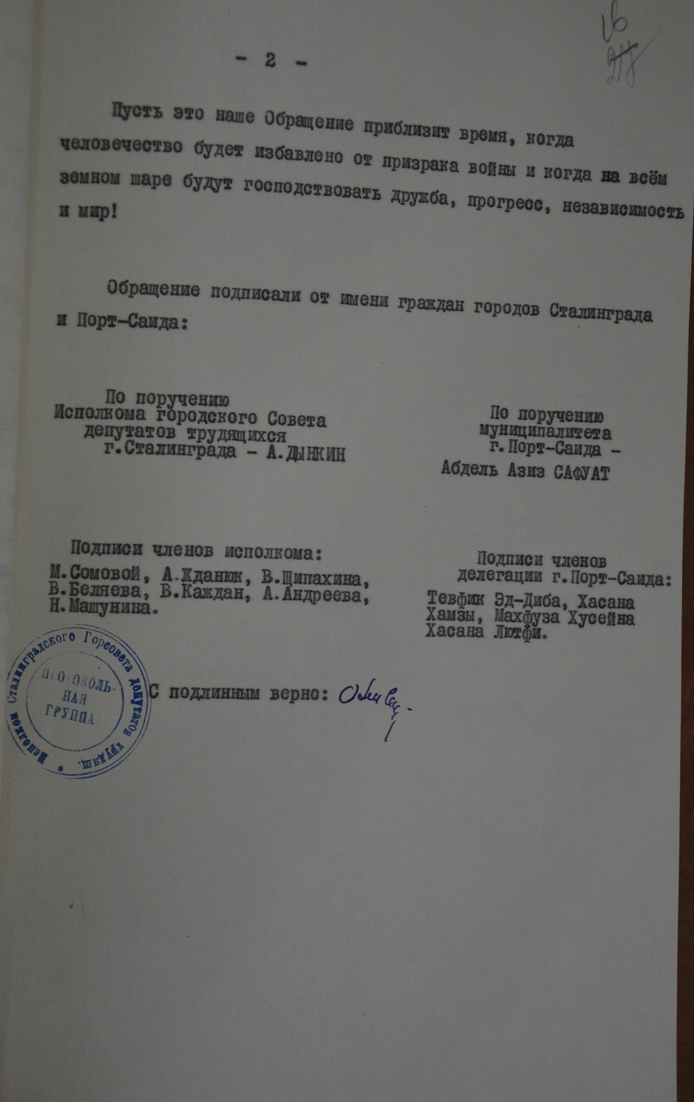 В 1957 году граждане Волгограда и Порт-Саида выпустили совместное обращение к народам всех стран с призывом запретить оружие массового уничтожения.