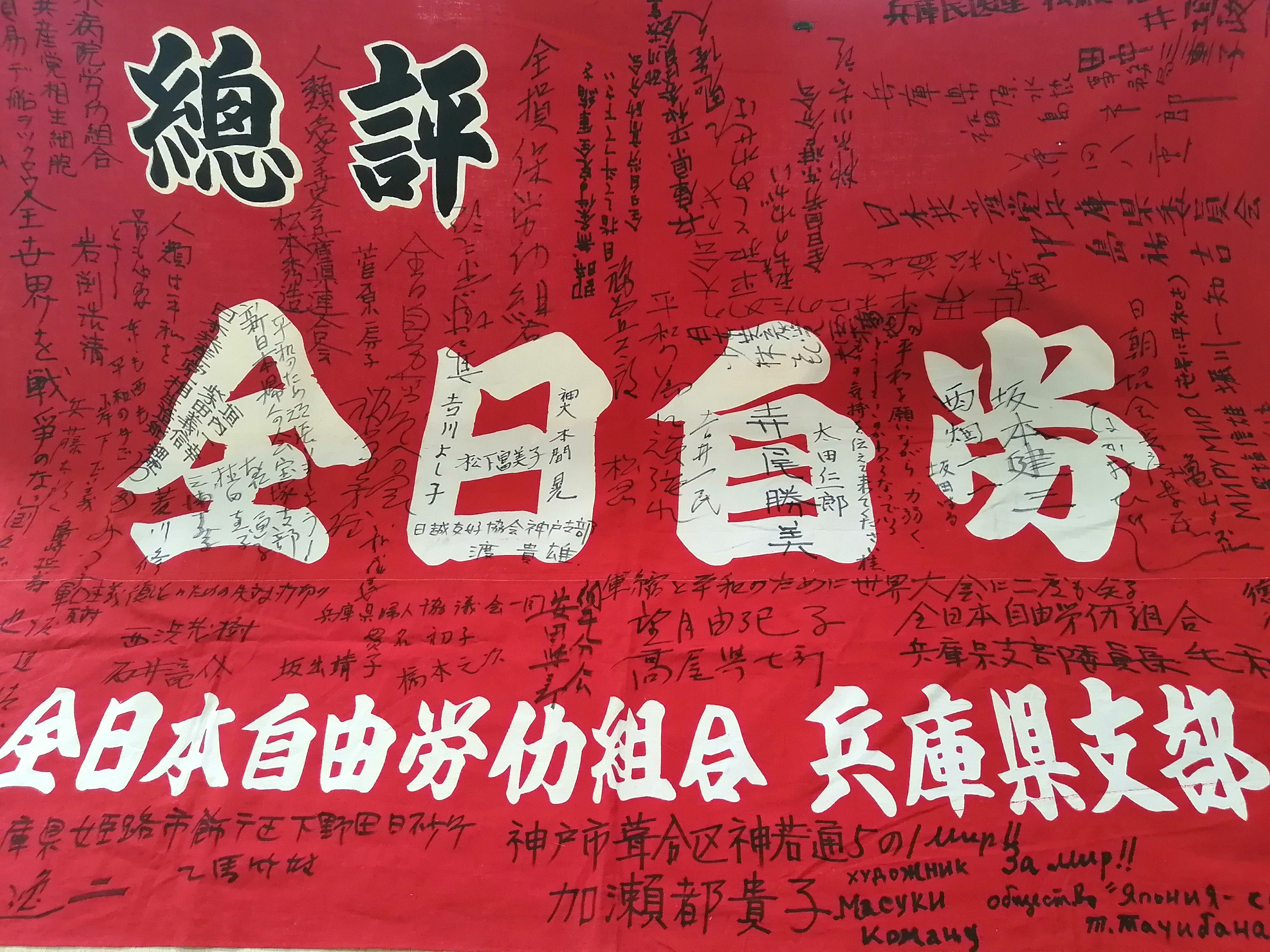 – Вот, например, газета из того самого города Кобе, про который мы только что говорили. В 70-е годы отделом литературы на иностранных языках у нас заведовала женщина, которая знала японский язык. По ее приглашению, насколько мне удалось узнать, нас однажды посетили представители Кобе – скорее всего, рабочие какого-то завода, где налаживали совместное советско-японское производство. С их участием в нашей библиотеке прошло заседание российско-японского клуба. Уезжая из города, они подарили нам красный флаг или, скорее, транспарант, на котором вручную оставили десятки посланий. Перевод этих надписей сейчас, к сожалению, уже утрачен, но вот здесь по-русски выведено "Миру – мир", чуть ниже – "Масуки Комацу – художник за мир", а рядом упоминается Общество "Япония – СССР". Уже после возвращения на родину японцы также прислали нам эту газету про свой город – без упоминания визита в Волгоград, просто как привет от далеких знакомых.