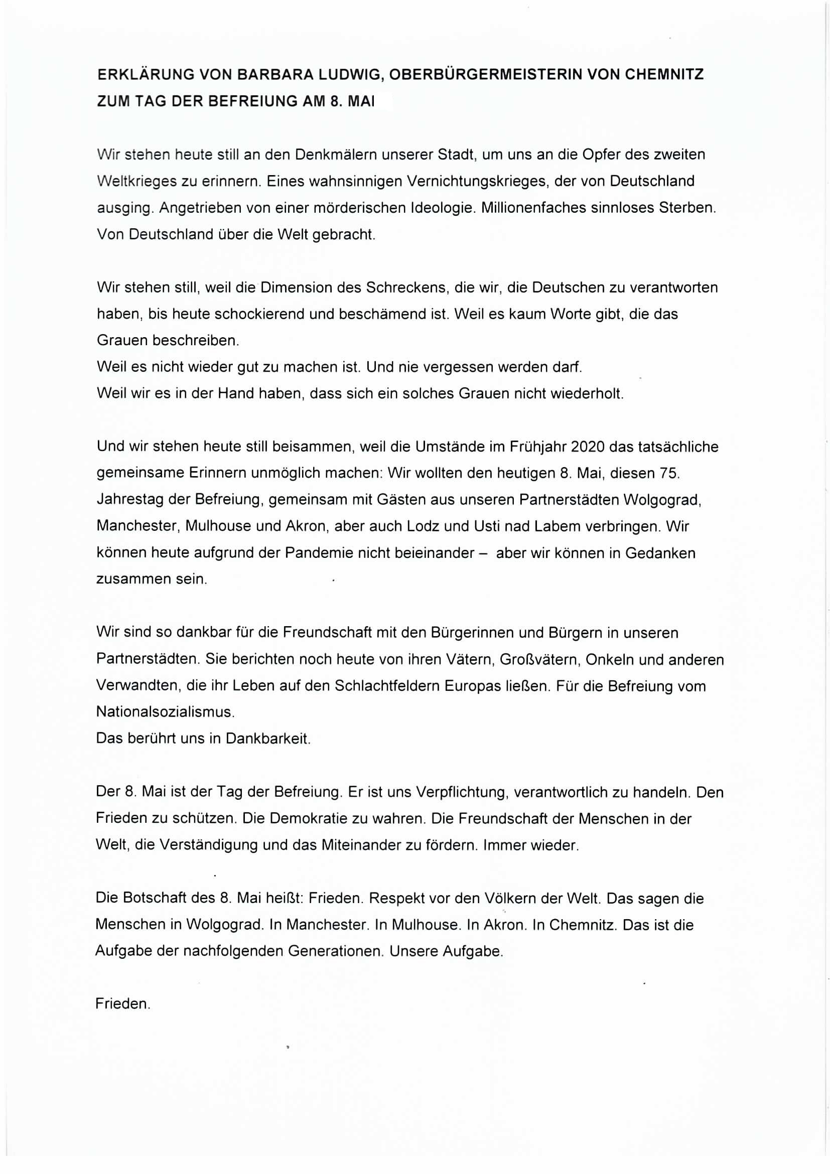 У памятника "Героям, павшим в боях за свободу и независимость нашей родины" госпожа Барбара Людвиг, обербургомистр Хемнитца, приняла участие в церемонии возложения цветов и выступила с обращением, текст которого мы публикуем на этом сайте. В 2020 году исполняется 75 лет со дня окончания Второй мировой войны, и хотя этот праздник Волгоград и его европейские города-партнеры отмечают в разные дни - 8 и 9 мая, - нас объединяет то значение, которое мы вкладываем в эту дату: скорбь о погибших, благодарность защитникам, освободившим человечество от нацизма и фашизма, и стремление, чтобы подобные трагедии не повторились.