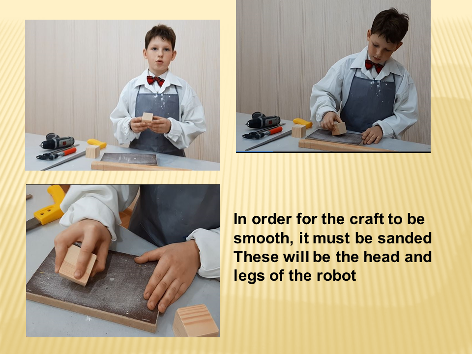 Мы с моим другом Никитой ходим учиться столярному делу в креативную студию "Творцы Волгограда". Там мы учимся работать с деревом. Я уже сделал цветочную корзину, карандашницу, ключницу, самолет, вертолет и меч. А сегодня я хочу показать вам, как сделать из дерева игрушечного робота.
