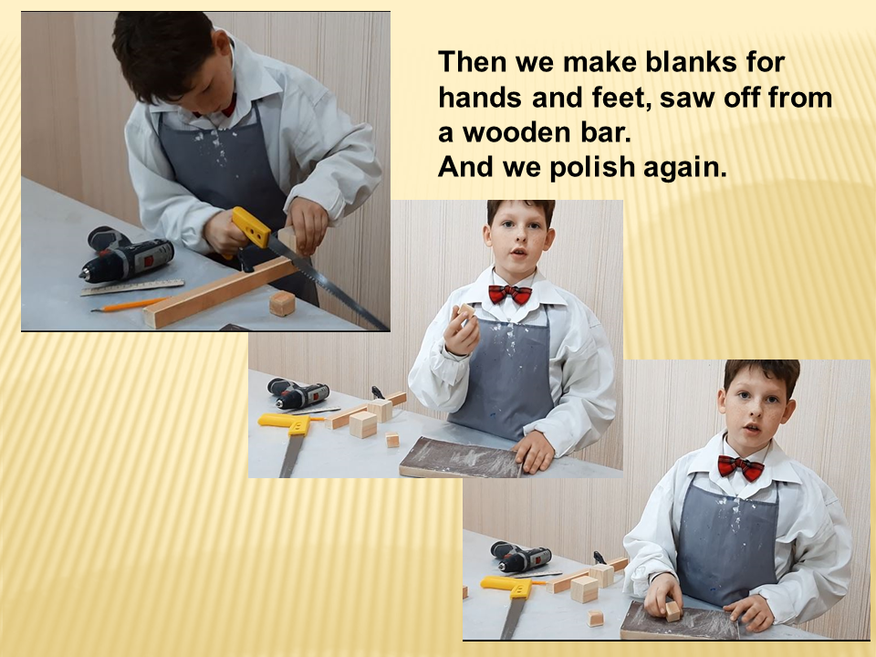 Теперь нам нужны заготовки для рук и ступней, и мы отпилим их от бруска. И снова отполируем.