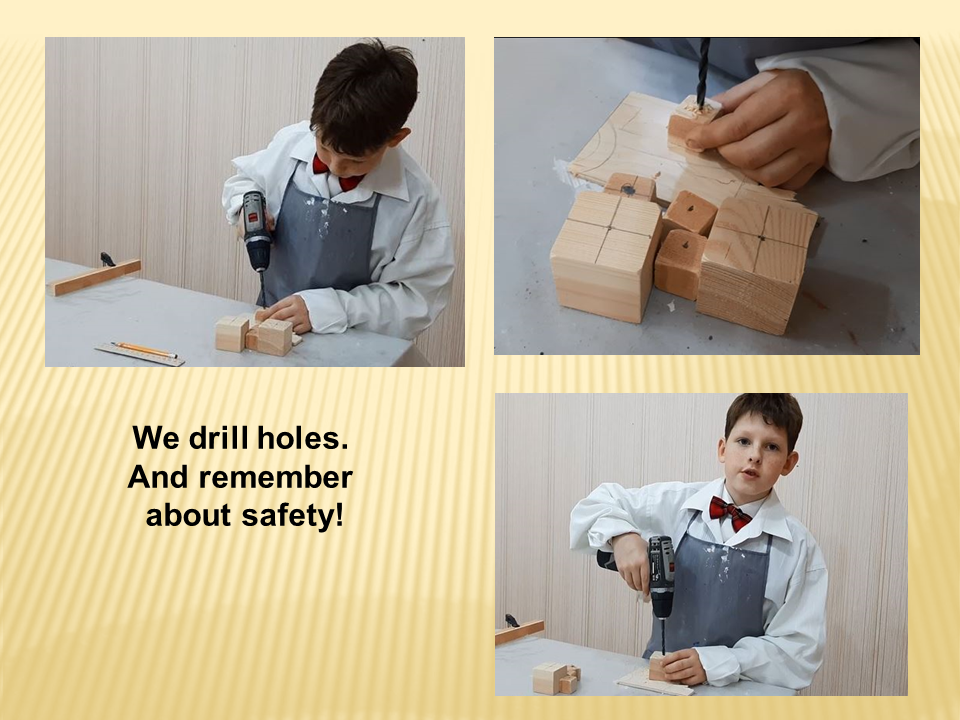 Кубики готовы; они станут основой для нашего робота. Но чтобы их соединить, нам нужно обозначить и просверлить дырки. Сверлим дырки – и помним про технику безопасности!