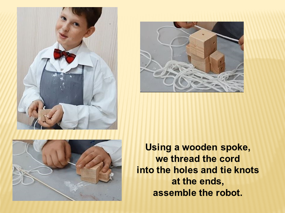 Отмеряем кусочек веревки нужной длины, отрезаем его. С помощью спицы продеваем веревку в дырочки и завязываем на концах узлы, собирая робота.