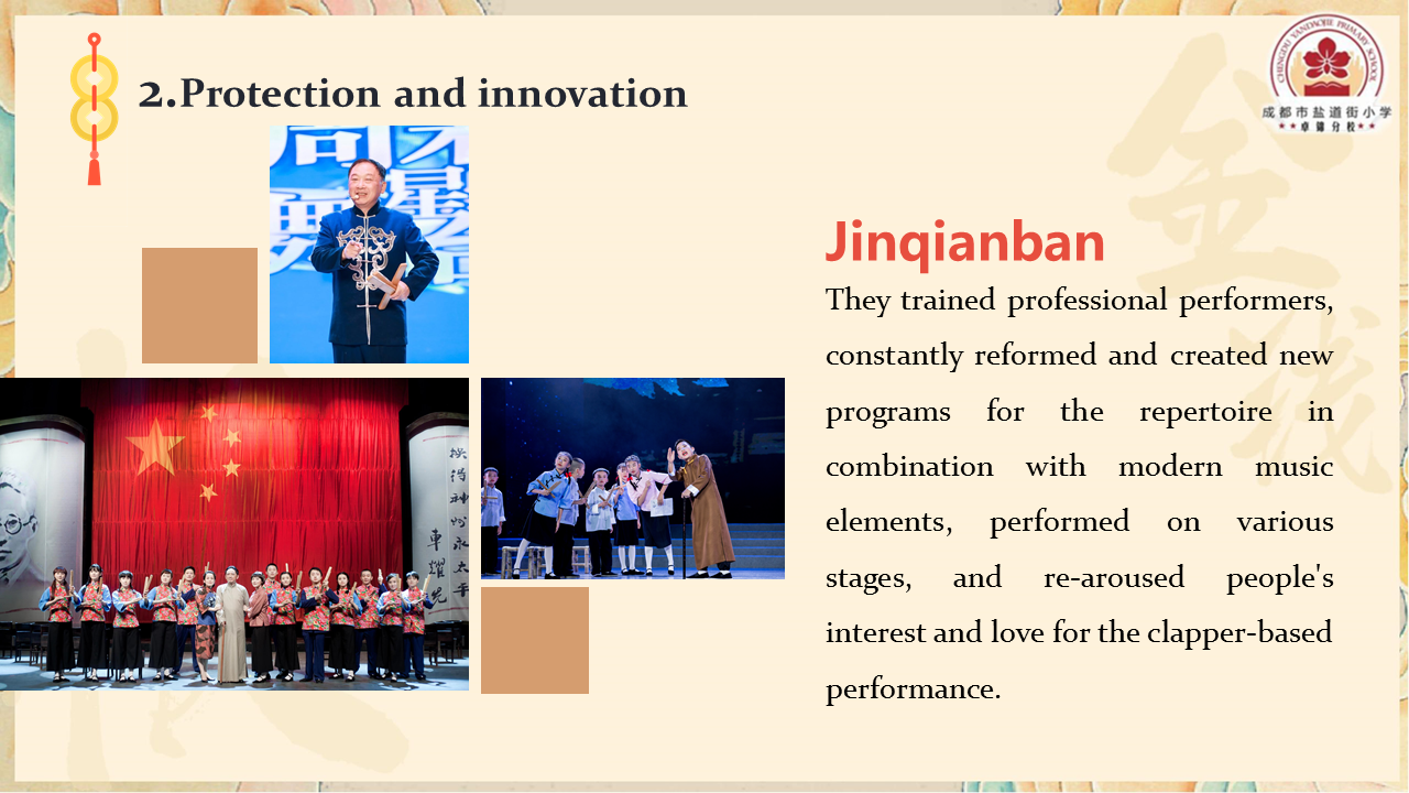 Третий аспект – это популяризация данной формы искусства в школах, где дети изучают цзиньцяньбань сами и рассказывают о нём другим людям. Сегодня цзиньцяньбань даже изучают на уроках музыки, чтобы ученики лучше поняли смысл и технику исполнения. Еще мы приглашаем на уроки профессиональных музыкантов в качестве экспертов и разрабатываем новые концертные программы.