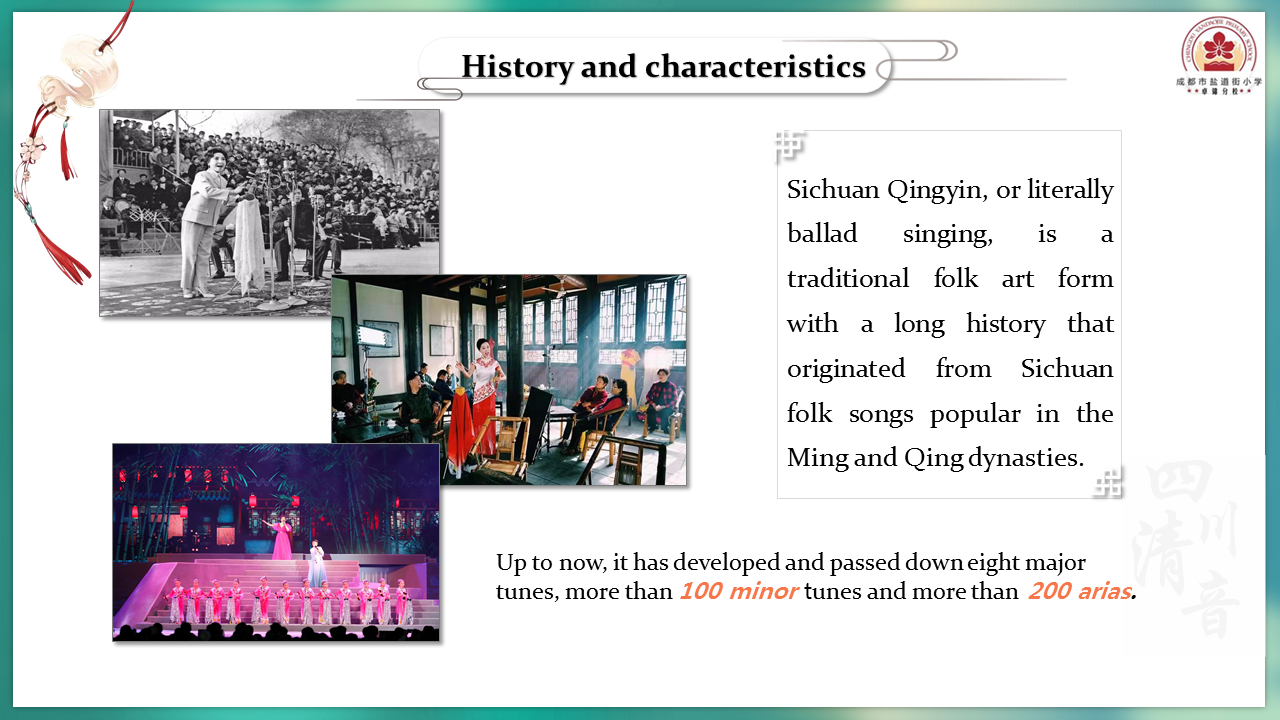 Сычуаньское цинъинь ("исполнение баллад"), это традиционная форма народного искусства с длинной историей. Она берет начало в народных песнях провинции Сычуань, которые были популярны в эпоху Мин и Цин. Эти баллады исполняются на региональном сычуаньском диалекте, который отличается большой музыкальностью и красотой звучания. Такое пение замечательно отражает нематериальное культурное наследие провинции Сычуань.