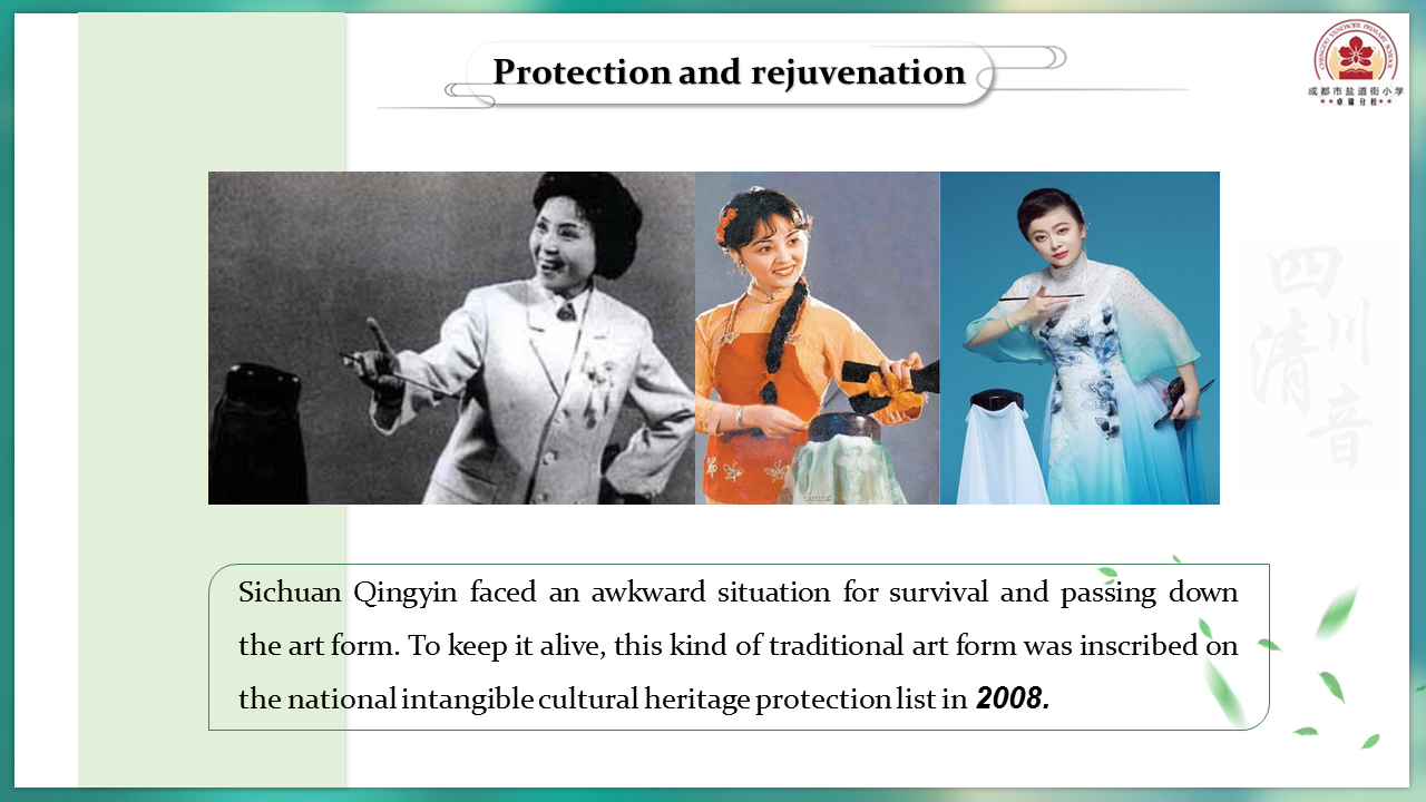 Второй аспект – это охрана и возрождение. Когда-то сычуаньское цинъинь переживало очень непростые времена и было вынуждено бороться за выживание. Это объясняет принятые меры по его охране, особенно деятельность профессиональных охранных институтов, которые разрабатывают посвященные цинъинь программы, используя за основу более современные музыкальные течения. Эти меры помогли возродить интерес публики к этому сценическому искусству.