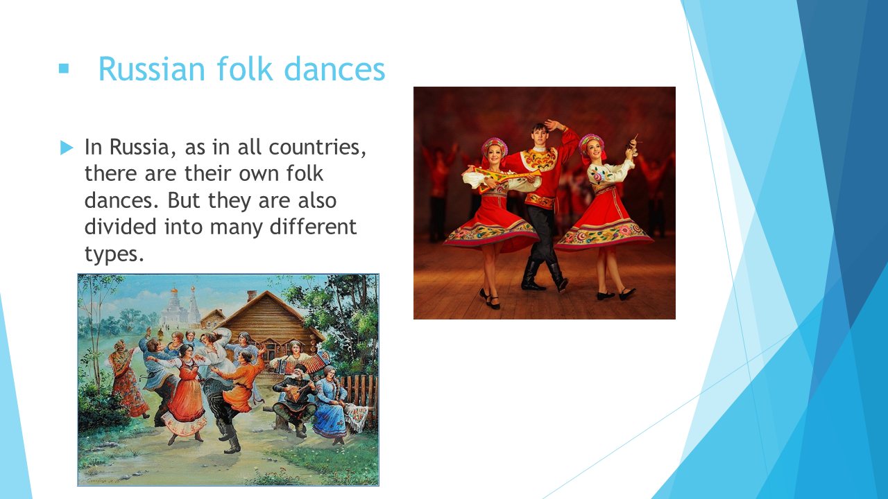 Существует множество типов русских танцев. Сейчас я расскажу о некоторых из них.