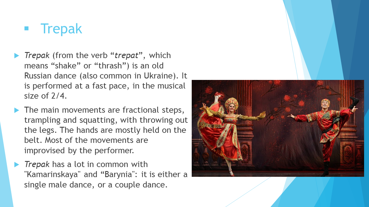 У трепака много общего с "Камаринской" пляской и "Барыней": исполняет этот танец или один солист-мужчина, или пара – мужчина и женщина.