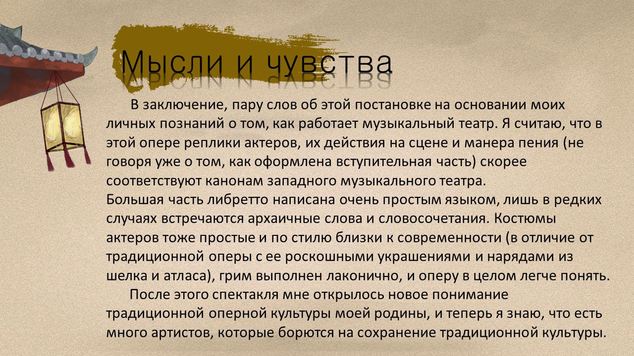 После этого спектакля мне открылось новое понимание традиционной оперной культуры моей родины, и теперь я знаю, что есть много артистов, которые борются на сохранение традиционной культуры.