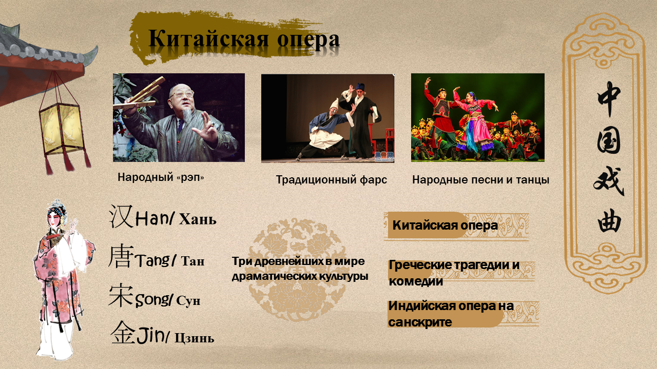 Китайская опера состоит из трех различных видов искусства: народной песни и танца, китайского народного рэпа и фарса. Это всеобъемлющий стиль сценического искусства с долгой историей, произошедший от обычных песни и танца. Оперное искусство в Китае формировалось и достигало вершины развития во времена династии Хань, династии Тан, династии Сун и династии Цзинь. Оно состоит из литературы, музыки, танцев, изобразительного искусства, боевых искусств, акробатики и исполнительского искусства. Существует около 360 видов оперного искусства. Для него характерно объединение многих форм искусства в единое целое, отражающее их индивидуальные особенности. Китайская опера, греческая трагедия и комедия и индийская санскритская опера известны как три древнейших драматических культуры мира. Сегодня я представлю вам такой вид китайской оперы как "Цюцзю".