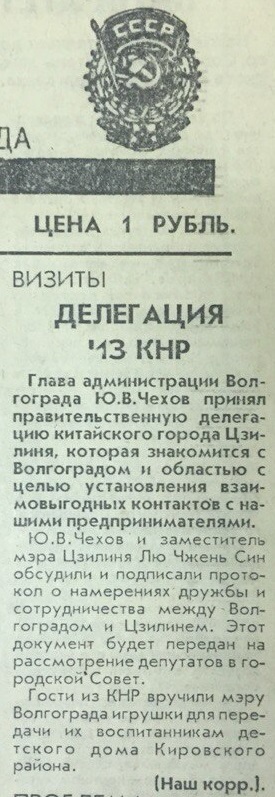 The twinning relations between Volgograd and Jilin have been established in 1994.