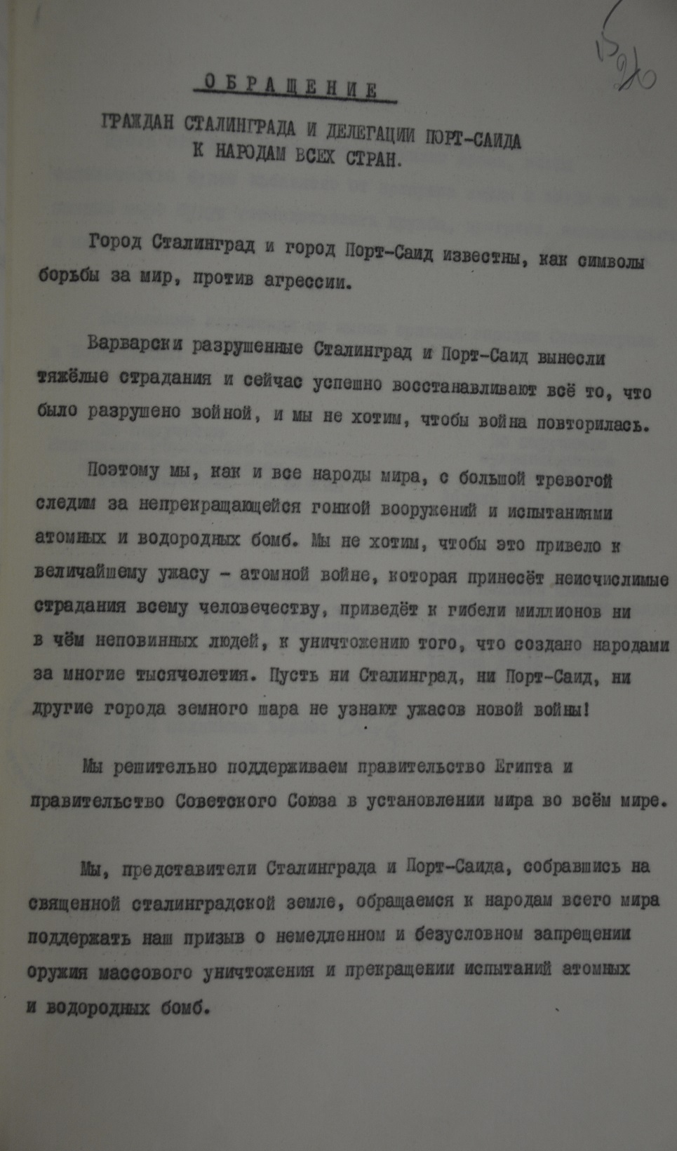 In 1957, the people of Volgograd and Port Said issued a joint appeal to the world nations calling for the immediate prohibition of the weapons of mass destruction.