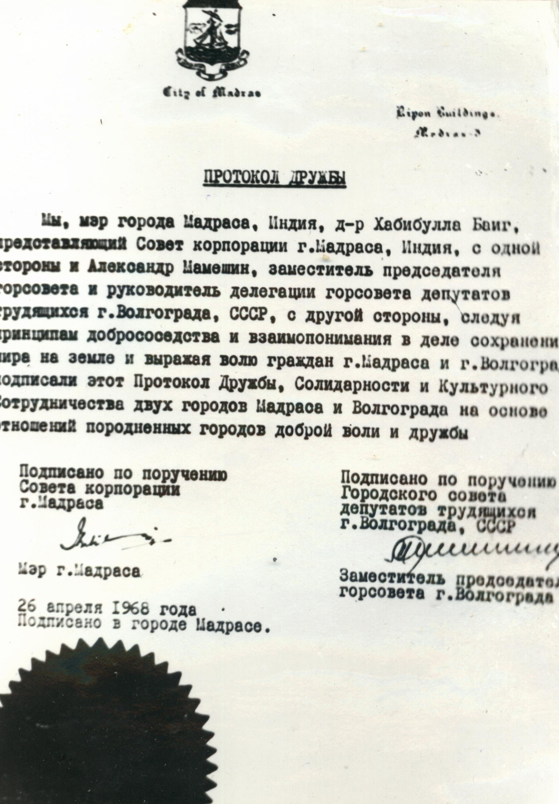 Volgograd and Chennai have been twinned since 1967.