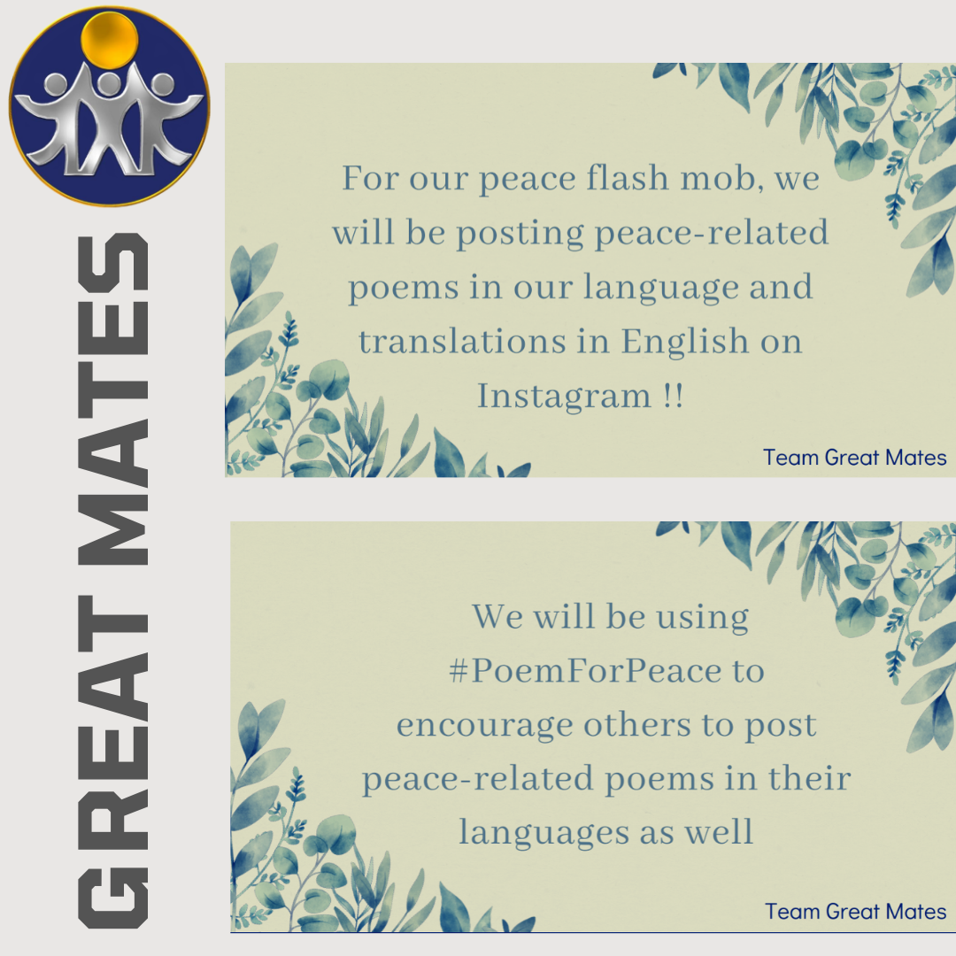 The @iycpf2021_GreatMates team is inviting to their flash mob both authors and translators. Choose your favorite poem about peace and translate in into English. Your works are welcome on Instagram – with the hashtag #poemforpeace