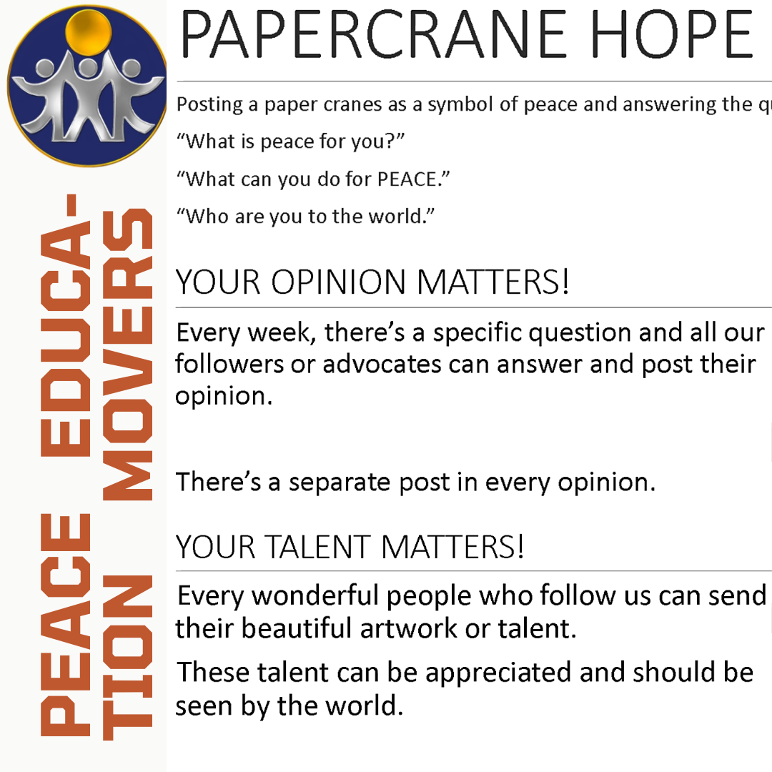The @PeaceEducationMovers team, too, has got big plans. Its members are inviting you to take part in the weekly Q&A event, demonstrate your talents in various fields, and post a photo of a paper crane captioned with your answer to the questions "What is Peace for me? What can I do for peace? Who am I to this world?"