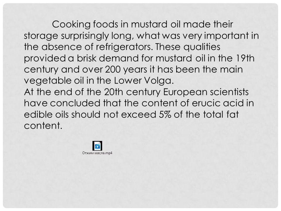 Cooking foods in mustard oil made their storage surprisingly long, what was very important in the absence of refrigerators. These qualities provided a brisk demand for mustard oil in the 19th century and over 200 years it has been the main vegetable oil in the Lower Volga. At the end of the 20th century European scientists have concluded that the content of erucic acid in edible oils should not exceed 5% of the total fat content.