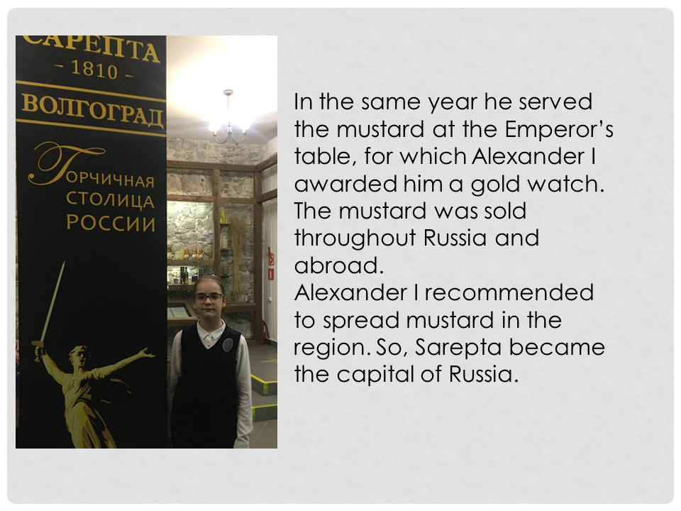 In the same year he served the mustard at the Emperor's table, for which Alexander I awarded him a gold watch. The mustard was sold throughout Russia and abroad. Alexander I recommended to spread mustard in the region. So, Sarepta became the mustard capital of Russia.