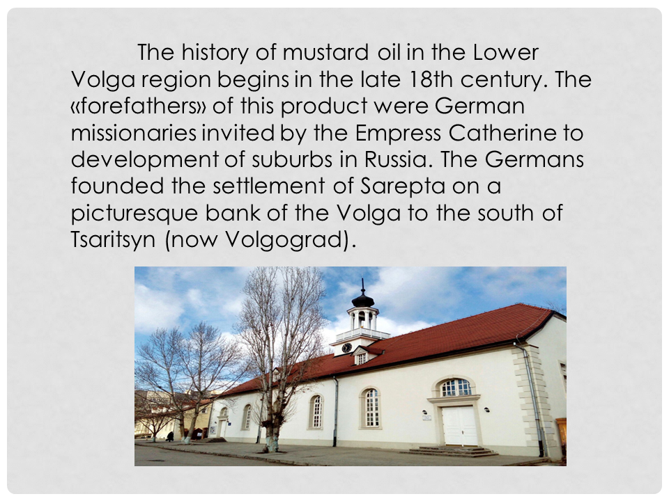 The history of mustard oil in the Lower Volga region begins in the late 18th century. The "forefathers" of this product were German missionaries invited by the Empress Catherine to develop the suburbs in Russia. The Germans founded the settlement of Sarepta on a picturesque bank of the Volga to the south of Tsaritsyn (now Volgograd).
