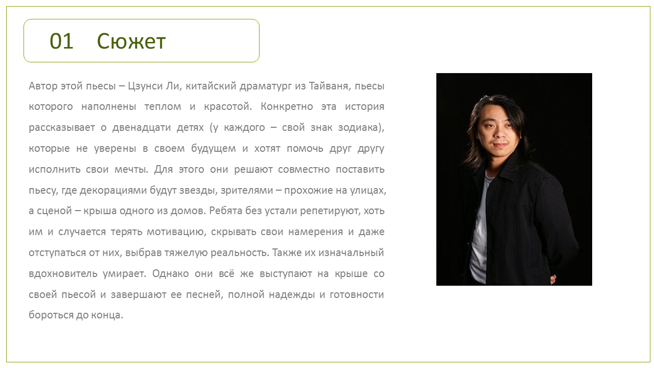 The author is a Chinese Taiwan dramatist Zongxi Li whose plays mostly spread warmth and beauty. The story is about twelve children of different zodiac signs who come together, from a confused future to pursuing their dreams together. For their dreams, they plan to star in a play together. With the stars as the backdrop, the streets as the audience and the rooftops as the stage, and they rehearsed the play tirelessly. They once lost their motivation, hid their original intentions and chose the harsh reality. Eventually, after the death of the original planner, they finally came together to perform their story on the rooftop, singing a song full of hope and perseverance.