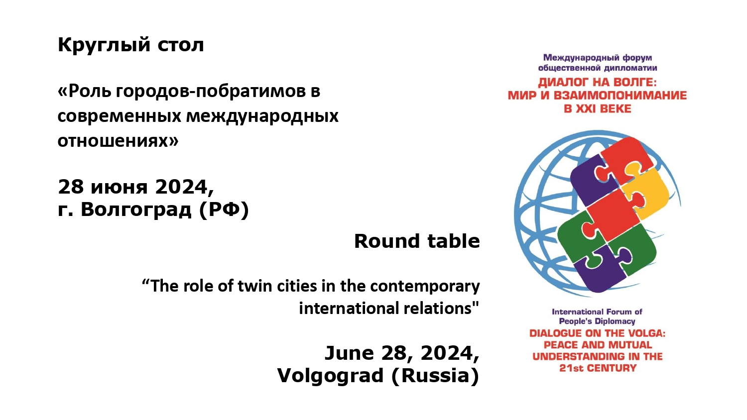On June 28th 2024 a round table "The role of twin cities in modern international relations" was held at Volgograd State Socio-Pedagogical University. It was organized by the Volgograd administration and the International Association "Twin Cities". The event was held within the framework of the annual International Forum of Public Diplomacy "Dialogue on the Volga: Peace and Mutual Understanding in the XXI Century" and was dedicated to the 80th anniversary of the first-ever twinning between Stalingrad (USSR) and Coventry (Great Britain), as well as the 60th anniversary of the International Association "Twin Cities".